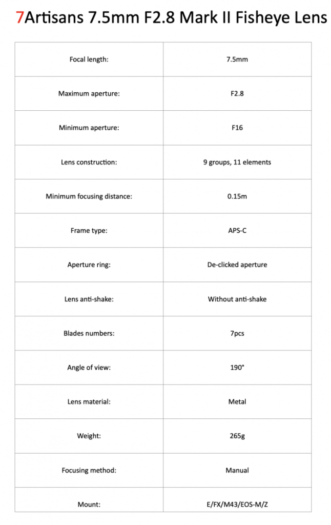 7Artisans will soon announce the new version of the current 7artisans 7.5mm f/2.8 Fisheye Lens. Below are the rumored specifications of 7artisans 7.5mm F2.8 Mark II:
