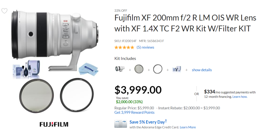 - Fujifilm XF 200mm F2 R LM OIS WR lens with XF 1.4x TC F2 WR Teleconverter Kit —$2,000 Off–B&H/ Adorama