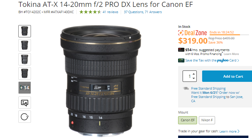 Super Hot Deal!!! Today, B&H has a great deal on Tokina AT-X 14-20mm F2 PRO DX lens for only $319, available for Canon EF / Nikon F mount. This is $180 cheaper than regular! Just for today only.