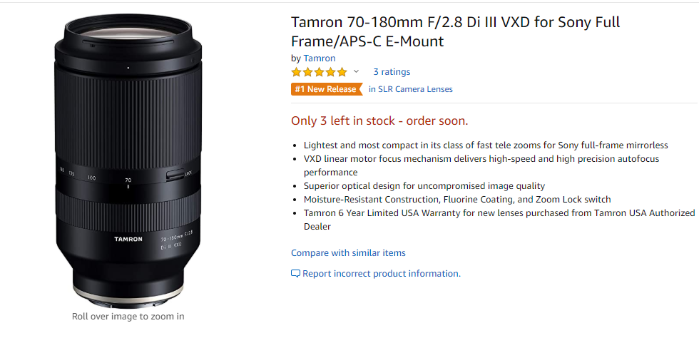 Good News!!! The newly announced Tamron 70-180mm f/2.8 Di III VXD lens is now first in stock and shipping at Amazon. This new lens costs $1,199 for Sony FE mount. There are only a few left in stock.